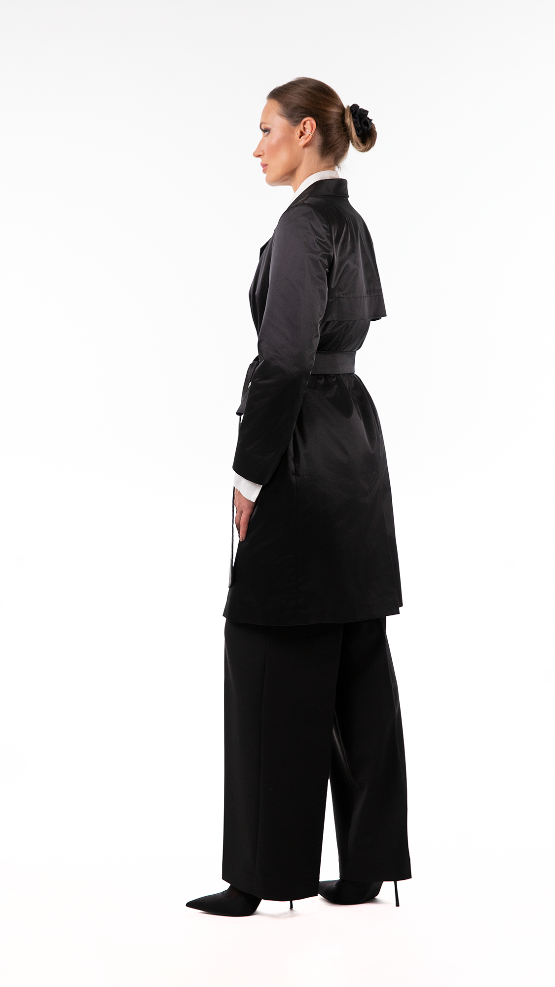 Tai klasikinio silueto, juodos spalvos lietpaltis, pagamintas iš natūralios medvilnės audinio. Priekyje ir nugaroje jis yra išformuotas reljefinėmis siūlėmis. Pagamintas su statytomis rankovėmis ir peteliais, klasikine apykakle. Jo priekis užsegamas žalvario spalvos, plonomis metalinėmis spaudemis. Jo šonuose kišenės su atlapais. Lietpaltis surišamas diržu. Nugaroje ties pečiais yra papetė, iš nugaros apačioje suprojektuotas skeltukas. Šį drabužį galite dėvėti kaip lietpaltį ir kaip švarką.