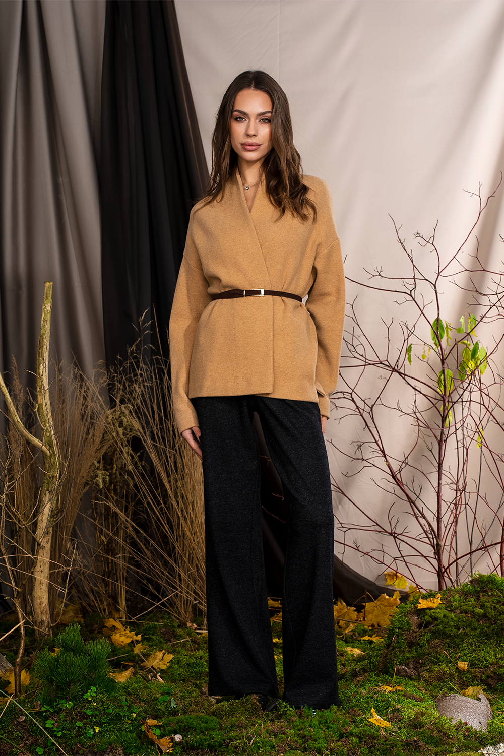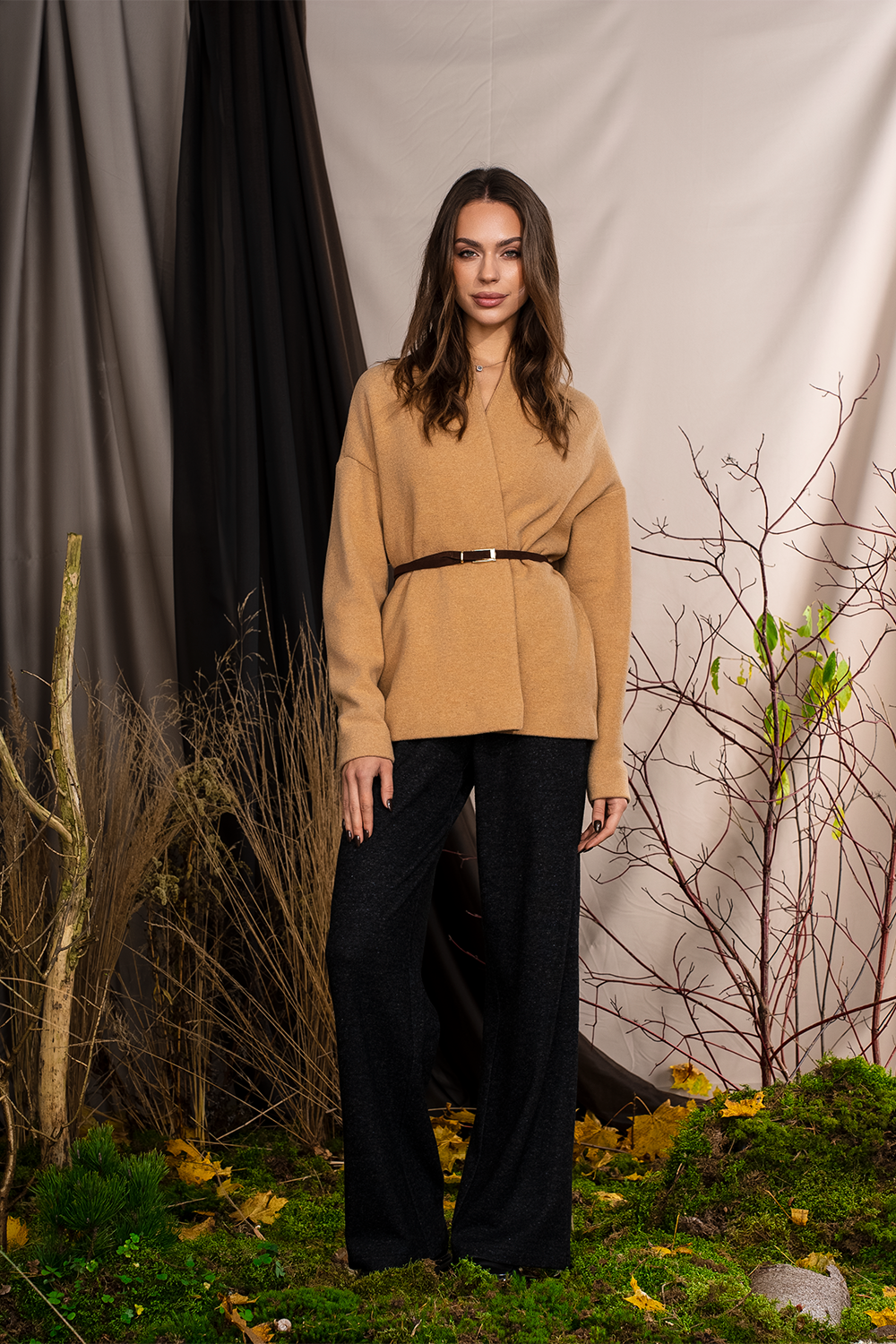 Šį Oversize stiliaus kardiganą "Rudens Oazė" sukūriau Jums, moterys, norėdama, kad jis taptų Jūsų asmenine ramybės oaze, pasiūta iš natūralaus vilnos audinio. Jis ne tik šildo - jis apgaubia švelnumu, primindamas lengvą rankos prisilietimą, nepavargstantį nuo rudens vėjo ar žiemos žvarbos. Elastingas ir atsparus laikui audinys nesiglamžo ir nesiburbuliuoja, leisdamas Jums atrodyti nepriekaištingai visą dieną. Tai drabužis, kuris Jus džiugins ne vieną sezoną.