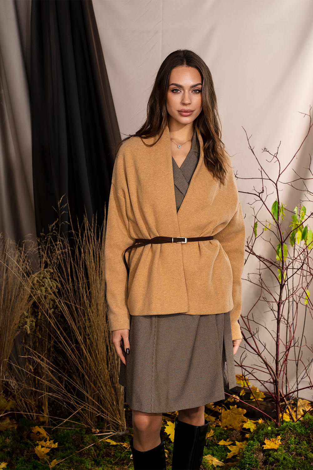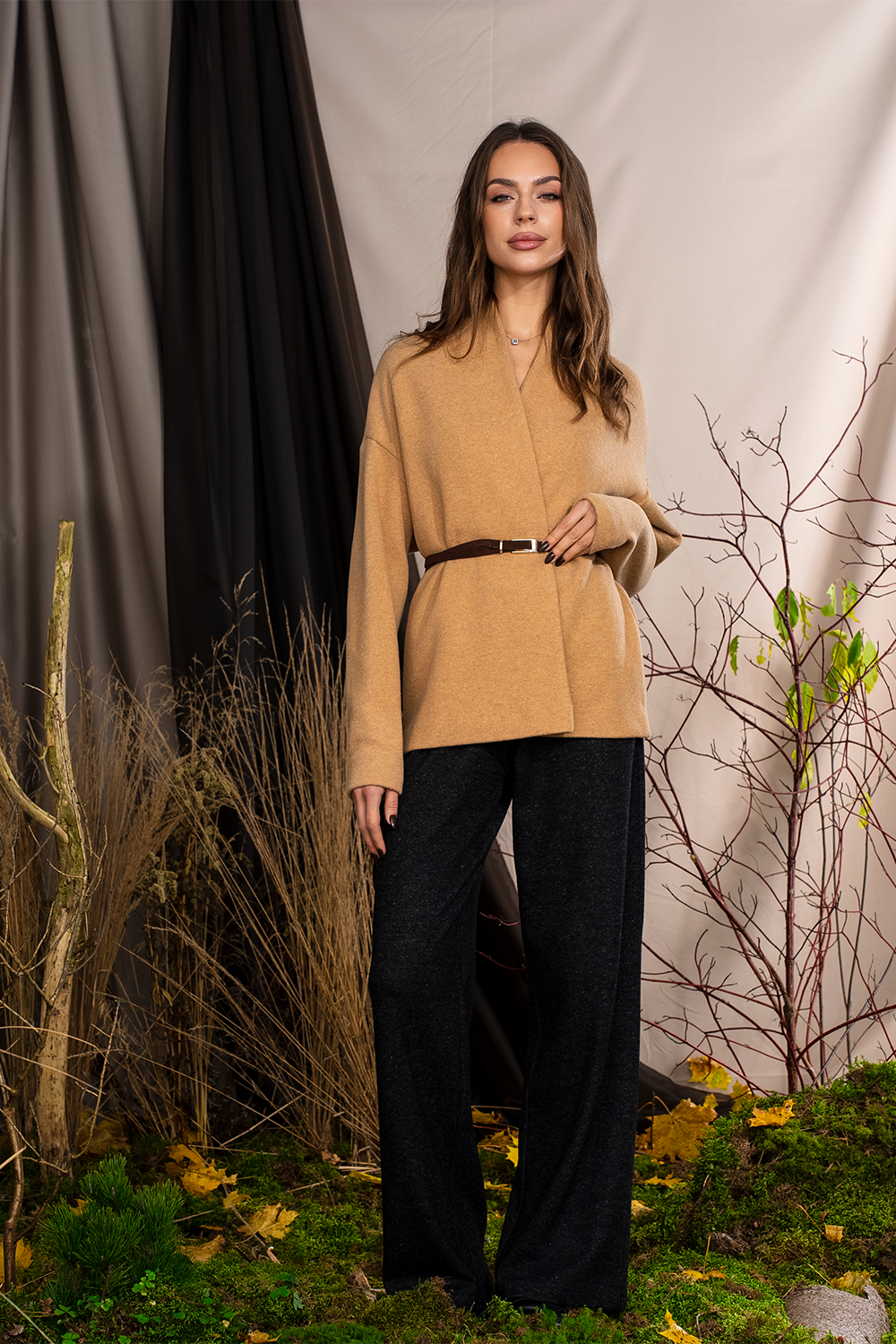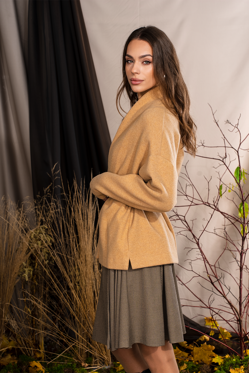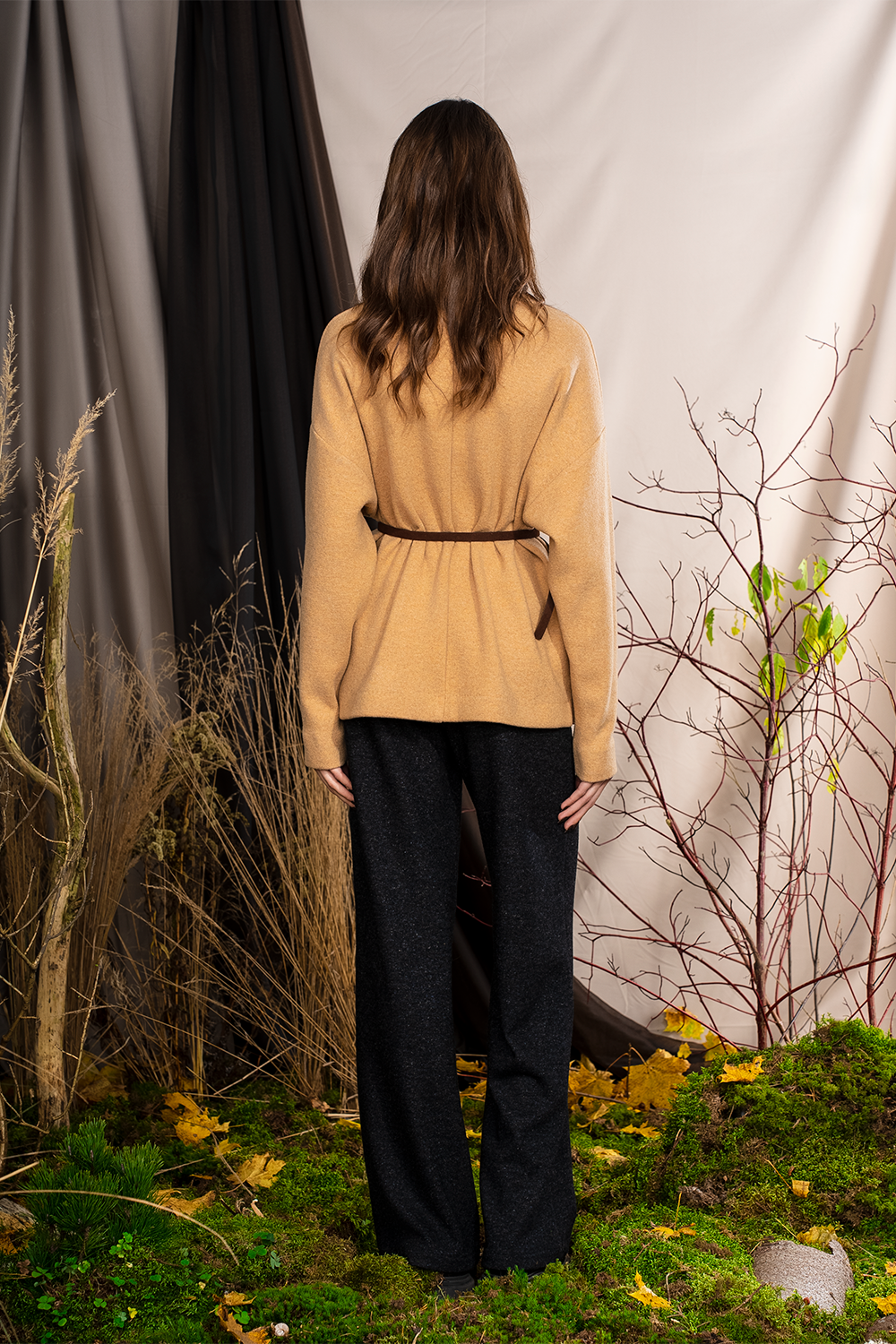 "Rudens Oazė" dizainas tai tarsi harmonija - apykaklę pasiuvau su stovele, priekis susiaučiamas dvigubu užmetimu, kuris kuria rafinuotą siluetą, o nuleisti pečiai ir šoniniai skeltukai dovanoja judesio laisvę. Šis kūrinys lengvai pakeičia švarką ar megztinį, tapdamas universalia Jūsų garderobo širdimi.