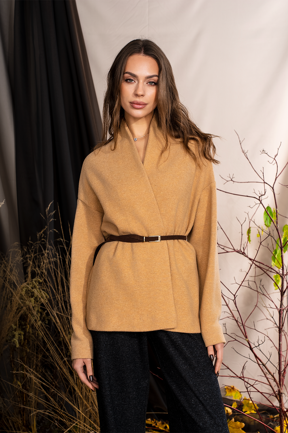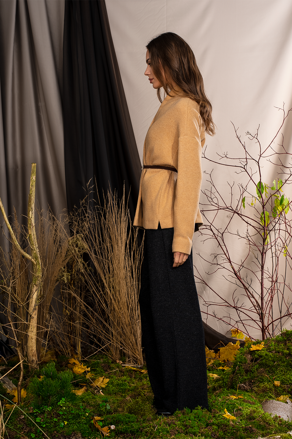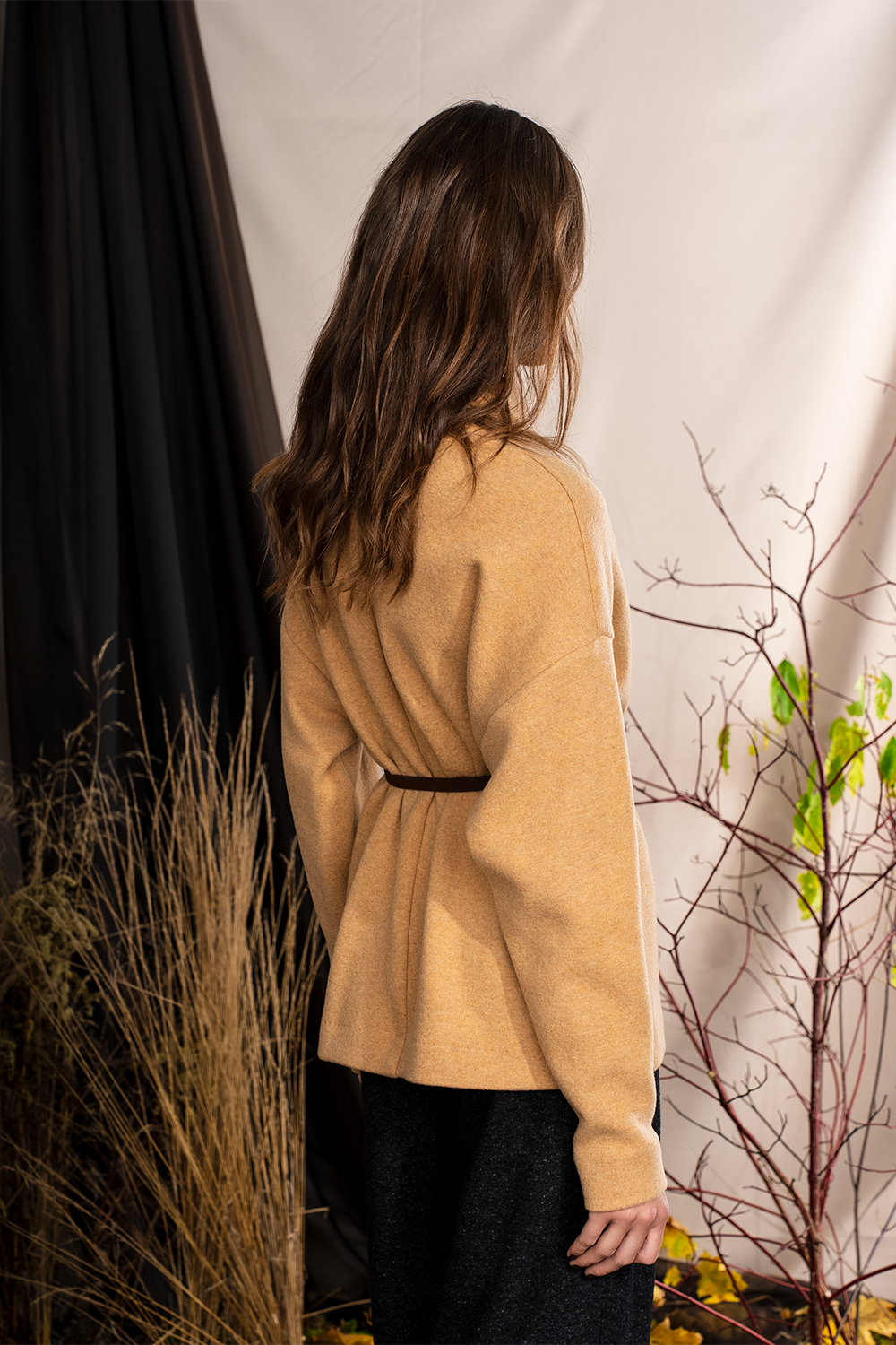 "Rudens Oazė" dizainas tai tarsi harmonija - apykaklę pasiuvau su stovele, priekis susiaučiamas dvigubu užmetimu, kuris kuria rafinuotą siluetą, o nuleisti pečiai ir šoniniai skeltukai dovanoja judesio laisvę. Šis kūrinys lengvai pakeičia švarką ar megztinį, tapdamas universalia Jūsų garderobo širdimi.