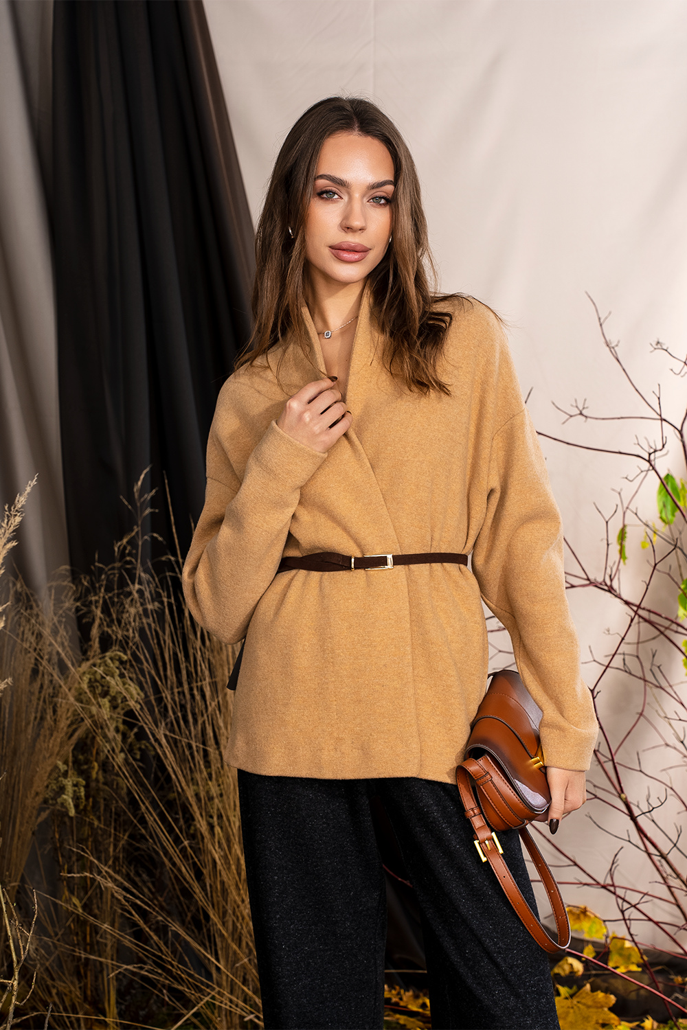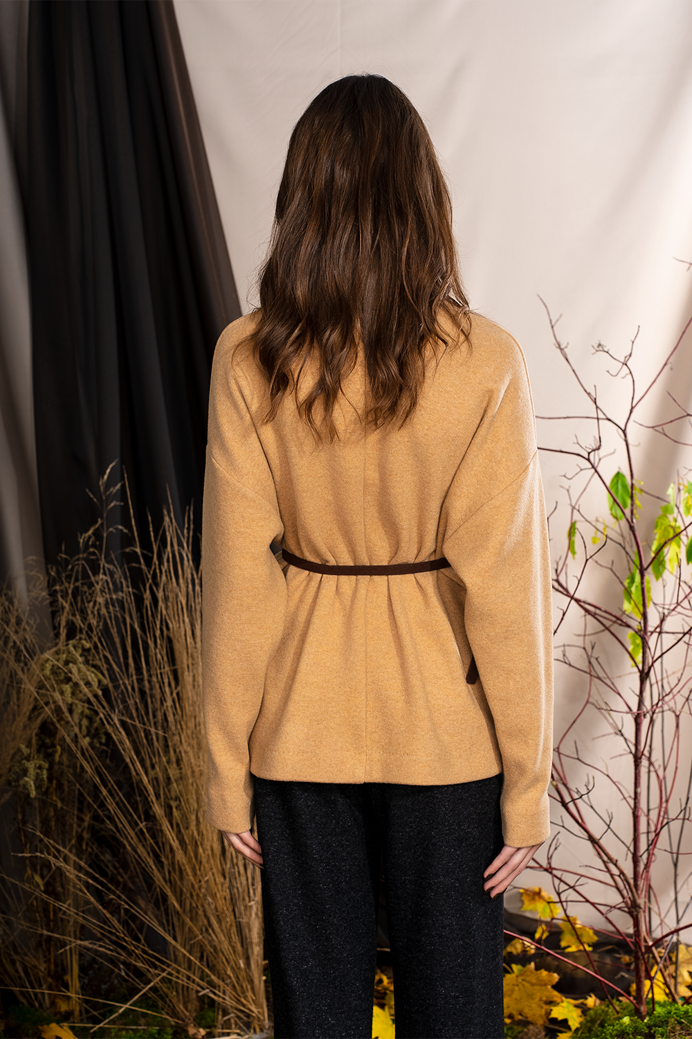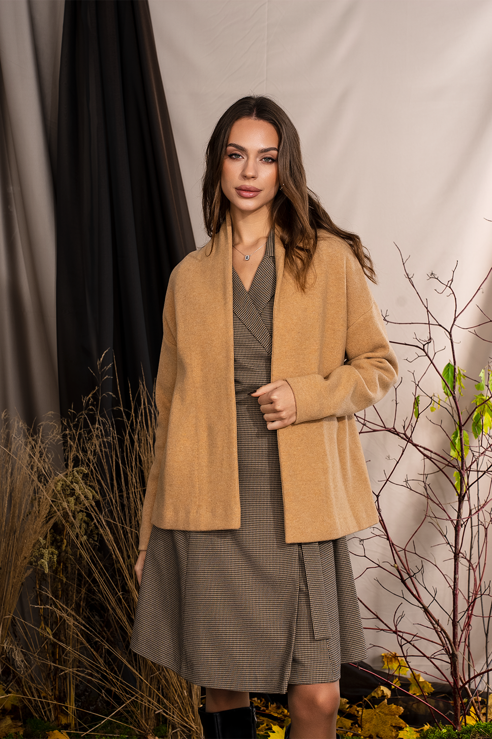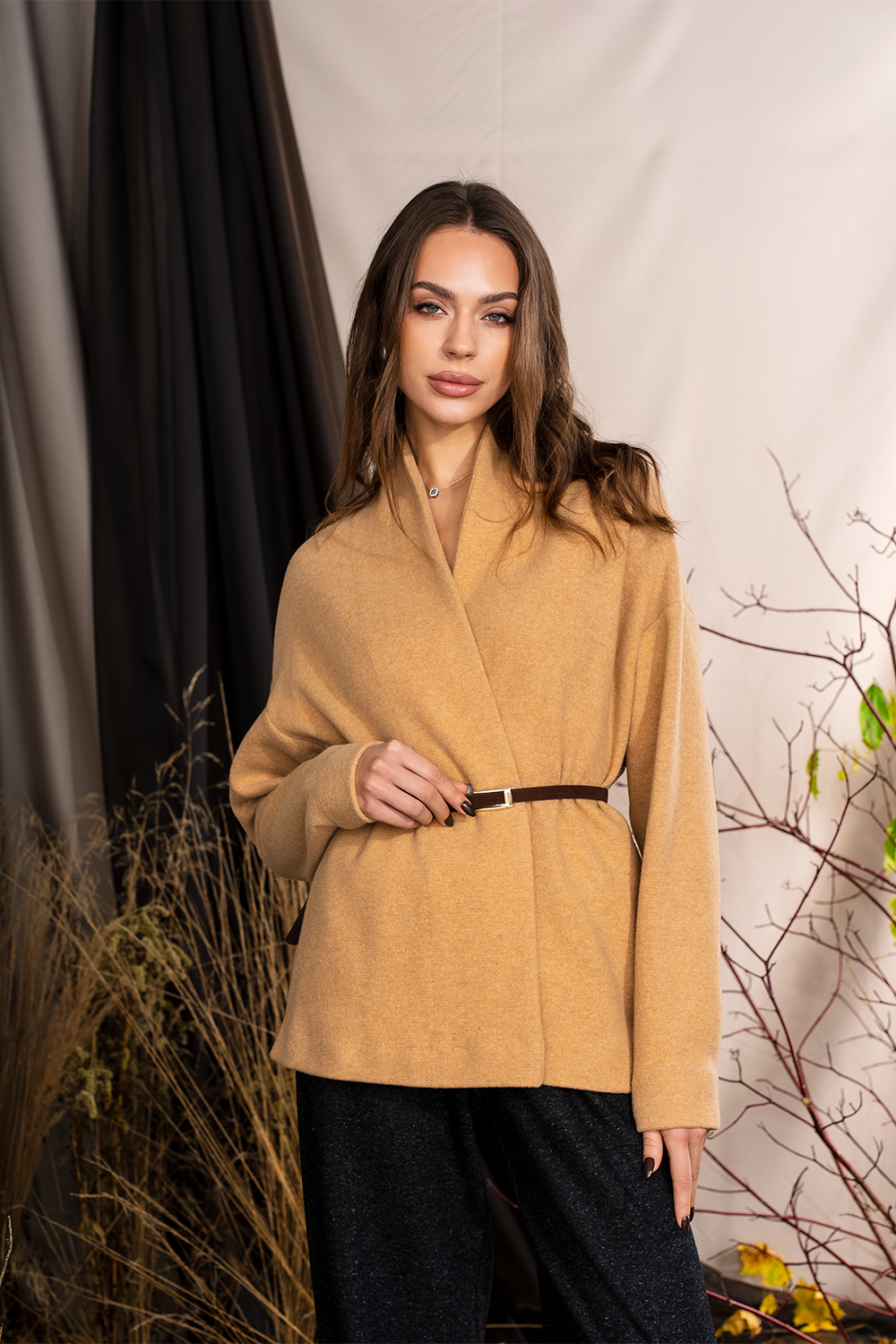 "Rudens Oazė" dizainas tai tarsi harmonija - apykaklę pasiuvau su stovele, priekis susiaučiamas dvigubu užmetimu, kuris kuria rafinuotą siluetą, o nuleisti pečiai ir šoniniai skeltukai dovanoja judesio laisvę. Šis kūrinys lengvai pakeičia švarką ar megztinį, tapdamas universalia Jūsų garderobo širdimi.