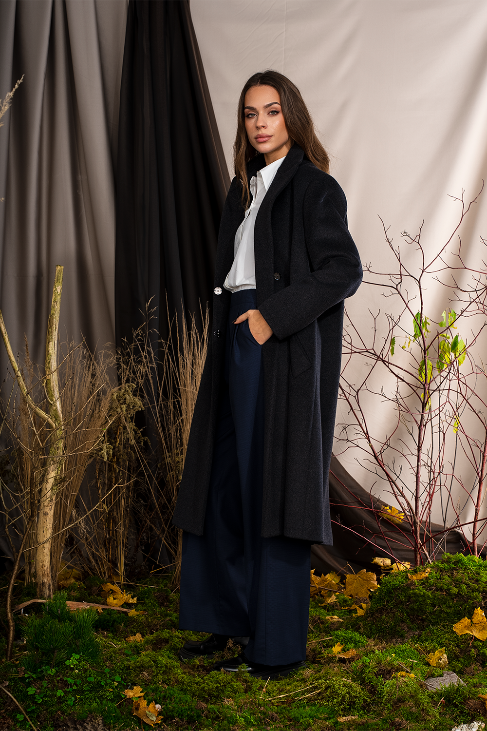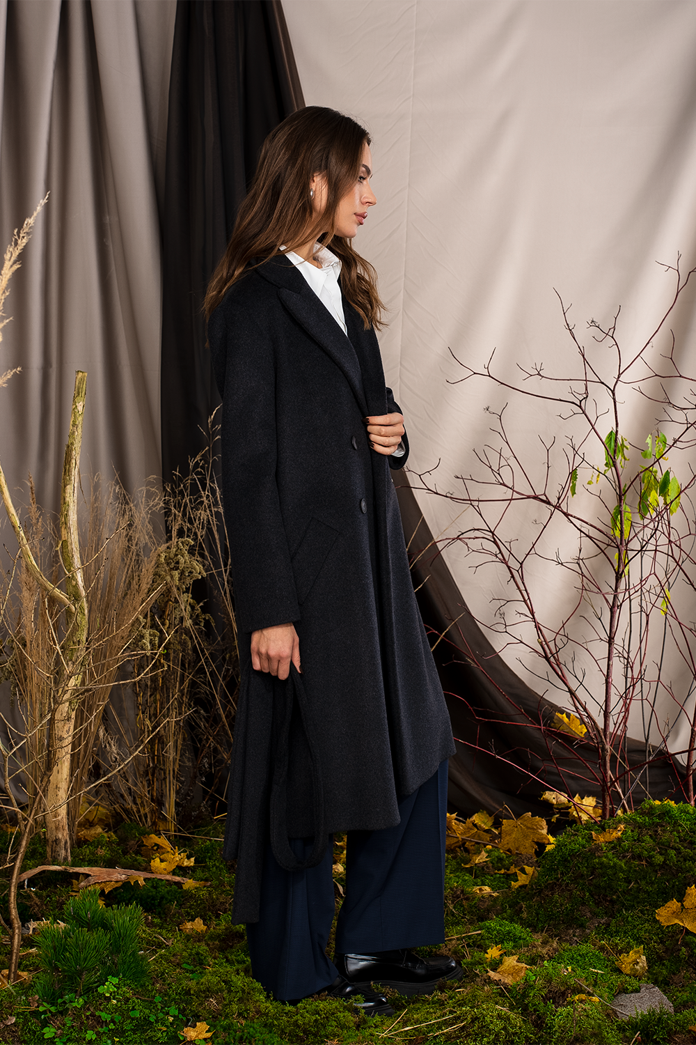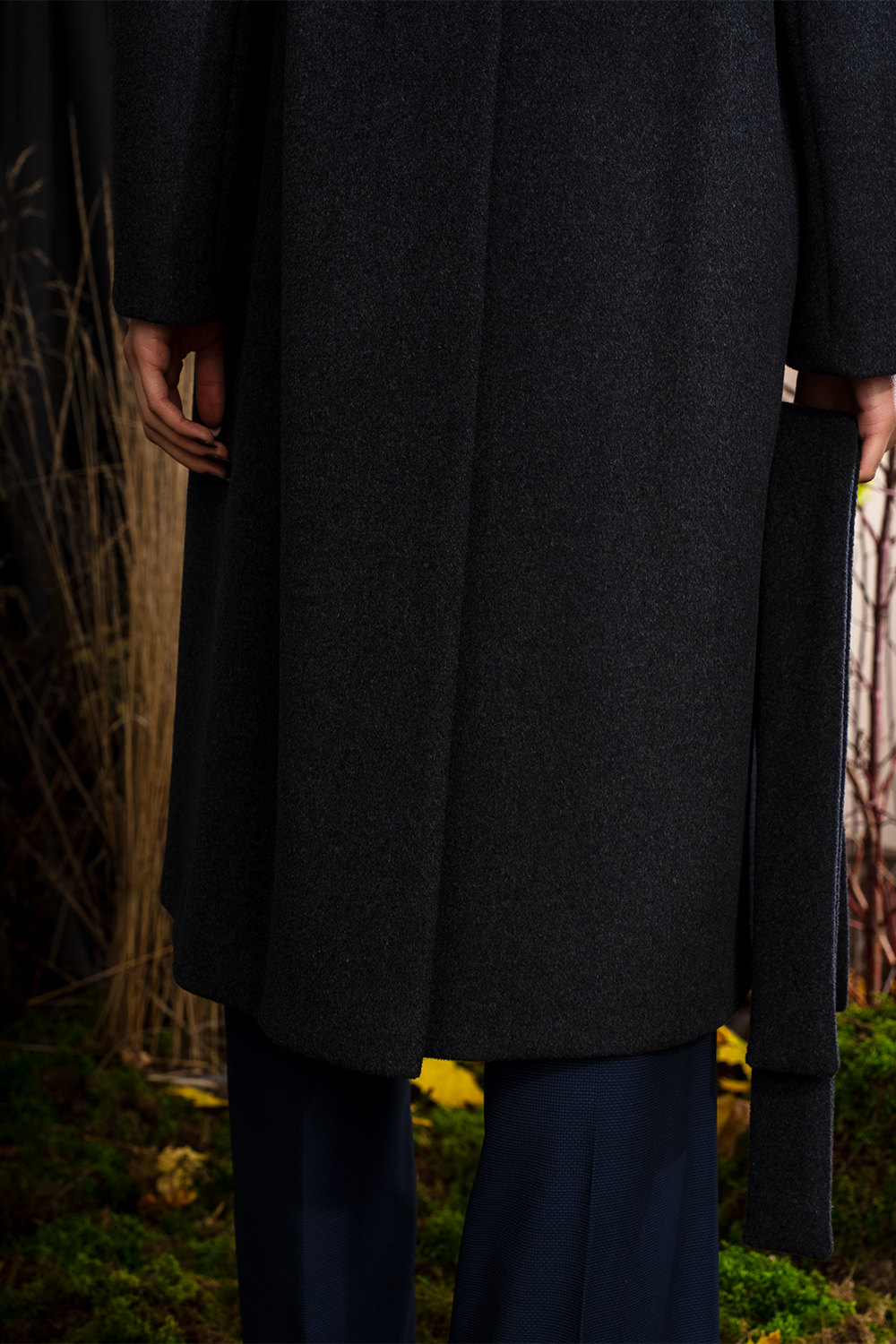 Sukūriau ir pagaminau klasikinį paltą moterims “Sovereign” – tai galios teikiantis drabužis, gimęs iš meilės ilgaamžiškumui ir prabangai. Paltas sukurtas iš natūralios vilnos audinio, kurio tamsiai pilka spalva subtiliai pereina į gilią, beveik juodos nakties, lyg per jaunatį, spalvą. Dėl audinyje esančios Kašmyro vilnos pluošto, audinys įgyja unikalų, vos žvilgantį plaukelį, kuris kalba apie aukščiausią kokybę. Šis paltas – tai investicija į ateitį ir tvarus pasirinkimas, džiuginsiantis Jus ne vieną šaltą sezoną.