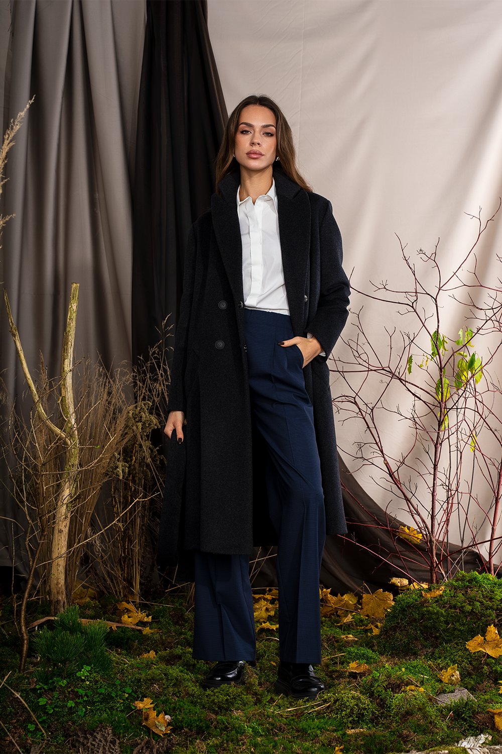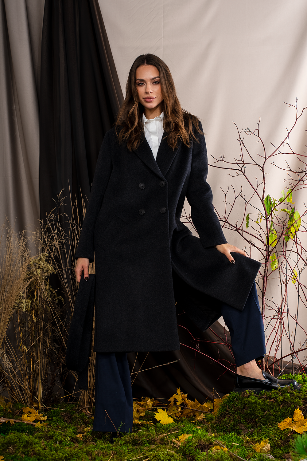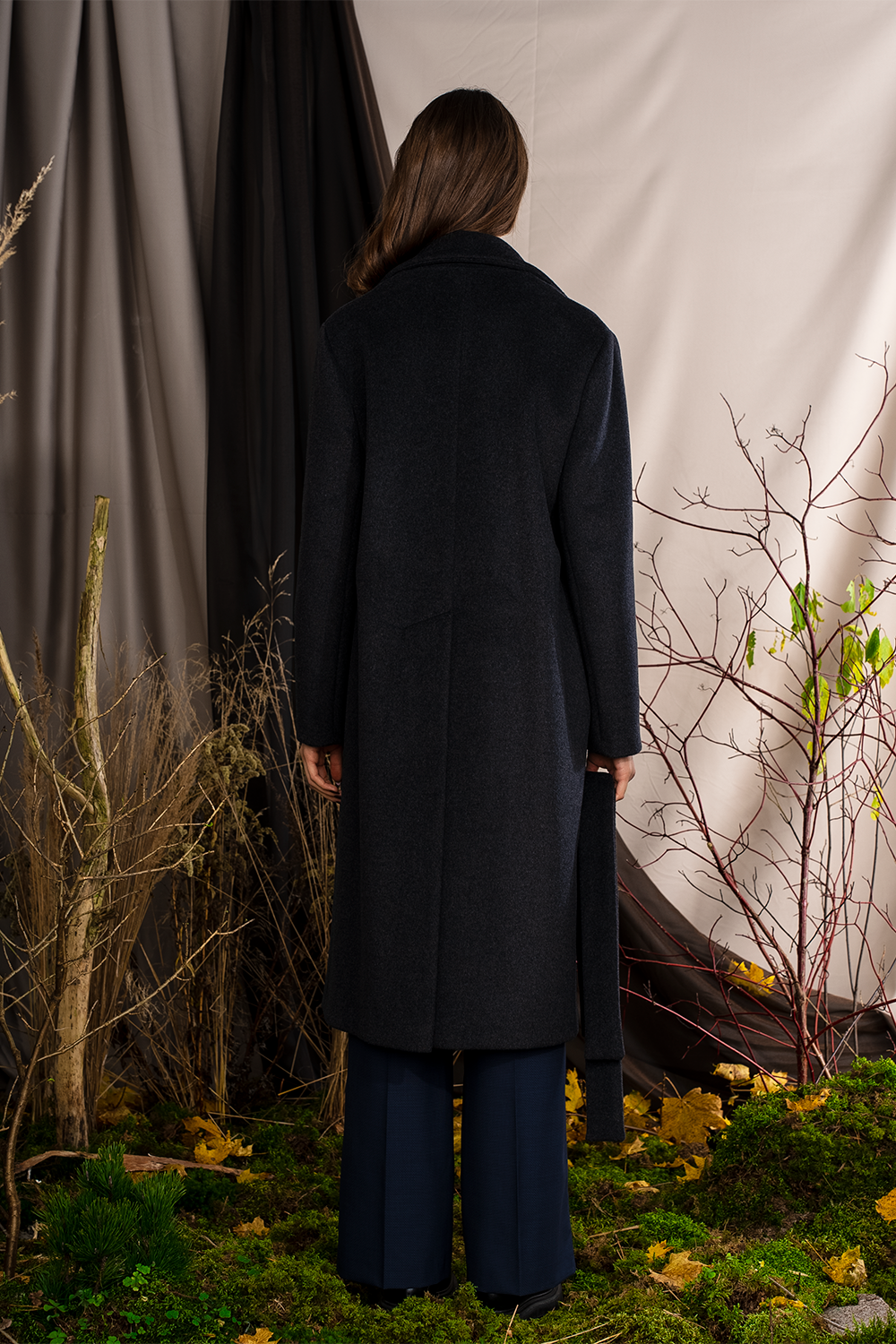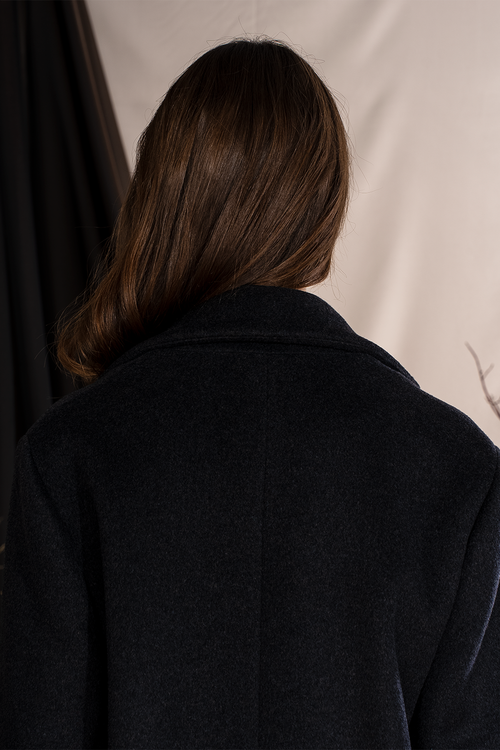 Palto "Sovereign" konstrukciją apgalvojau iki smulkmenų. Vidutinio dydžio klasikinė apykaklė ir dvigubas užmetimas per priekį sukuria solidumo ir elegancijos įvaizdį. Nors paltas susegamas spaudėmis, ant viršaus užsiūtos stilingos sagos, kurios tampa rafinuotu akcentu. Statytos, šiek tiek paplatintos rankovės per pečius suteikia siluetui jėgos ir modernumo, o šonuose įleistos kišenės su rėmeliu pabrėžia klasikinę eleganciją. Nugaroje įvesta ilga siūlė baigiasi giliu skeltuku, kuris garantuoja visišką judesių laisvę. Ties juosmeniu juosiamas diržas leidžia Jums pačiai rinktis, kaip formuoti savo siluetą – nuo laisvai krentančio iki griežtai įliemenuoto. Vidinė dalis išpildyta švelniu, juodos spalvos natūraliu viskozės pamušalu, kuris suteikia komforto pojūtį.