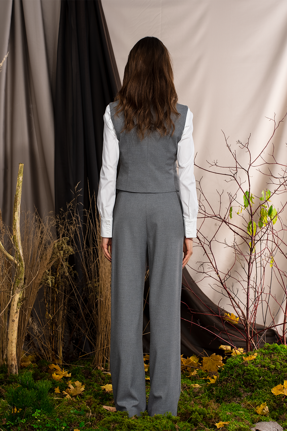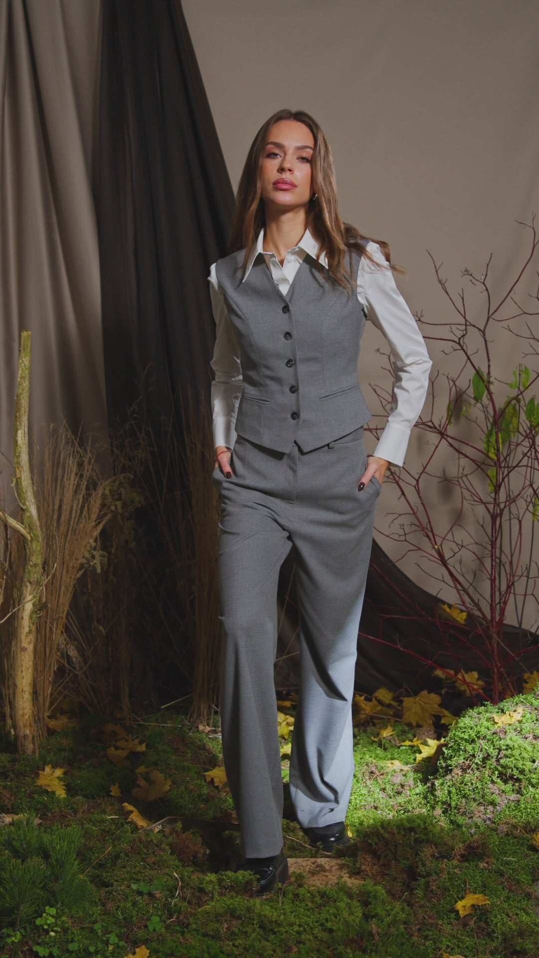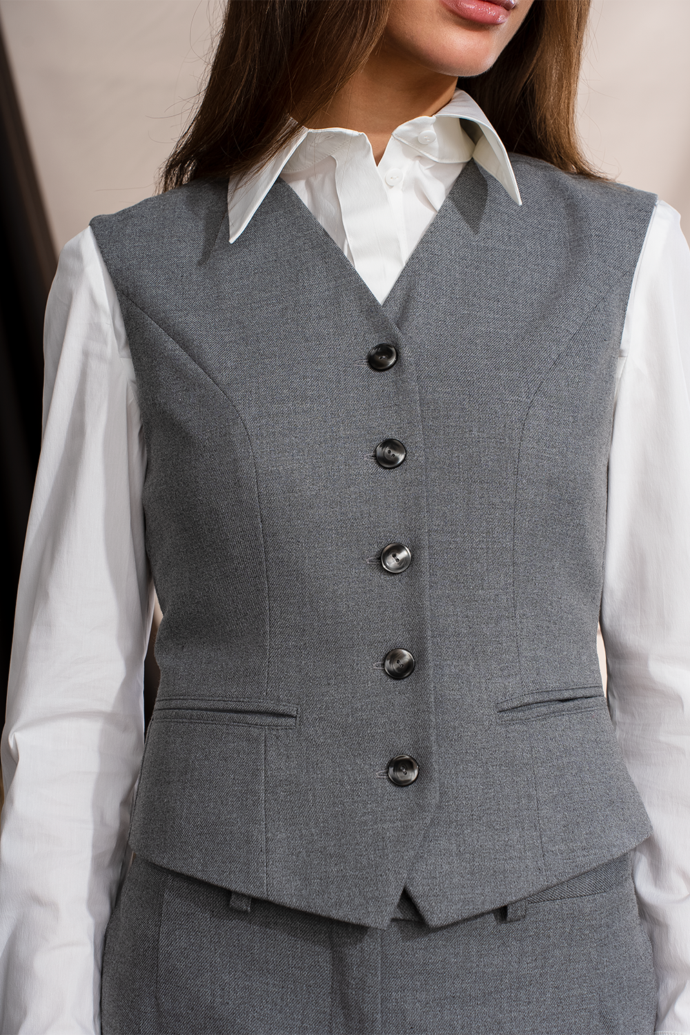 “Sidabro šydas” liemenė gimė iš minties, kad prabanga slypi juntamoje kokybėje. Liemenės siluetas įliemenuotas elegantiškomis reljefinėmis siūlėmis, o subtili V formos iškirptė prailgina kaklą. Šis drabužis kviečia prie sluoksniavimo meno. Priekis susegamas sagomis, o šonuose įkomponuotos horizontalios kišenaitės suteikia praktiškumo. Viduje Jus apglėbs minkštas, pilkos spalvos natūralus viskozės pamušalas.