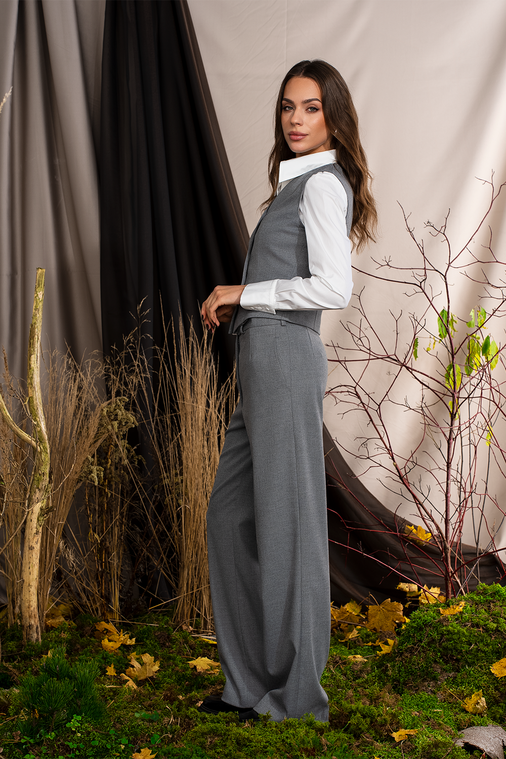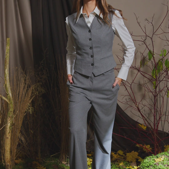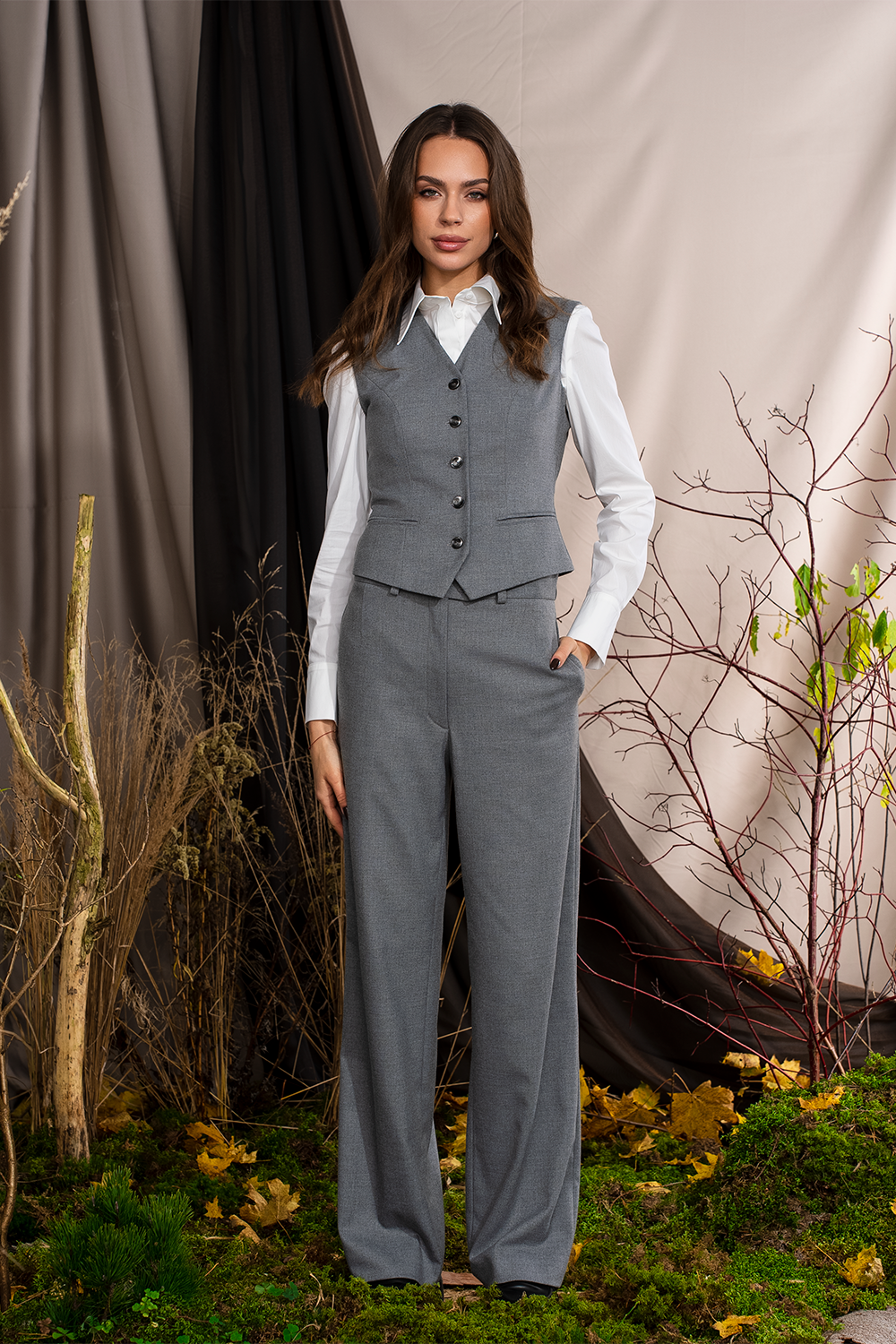 “Sidabro šydas” liemenė gimė iš minties, kad prabanga slypi juntamoje kokybėje. Liemenės siluetas įliemenuotas elegantiškomis reljefinėmis siūlėmis, o subtili V formos iškirptė prailgina kaklą. Šis drabužis kviečia prie sluoksniavimo meno. Priekis susegamas sagomis, o šonuose įkomponuotos horizontalios kišenaitės suteikia praktiškumo. Viduje Jus apglėbs minkštas, pilkos spalvos natūralus viskozės pamušalas.