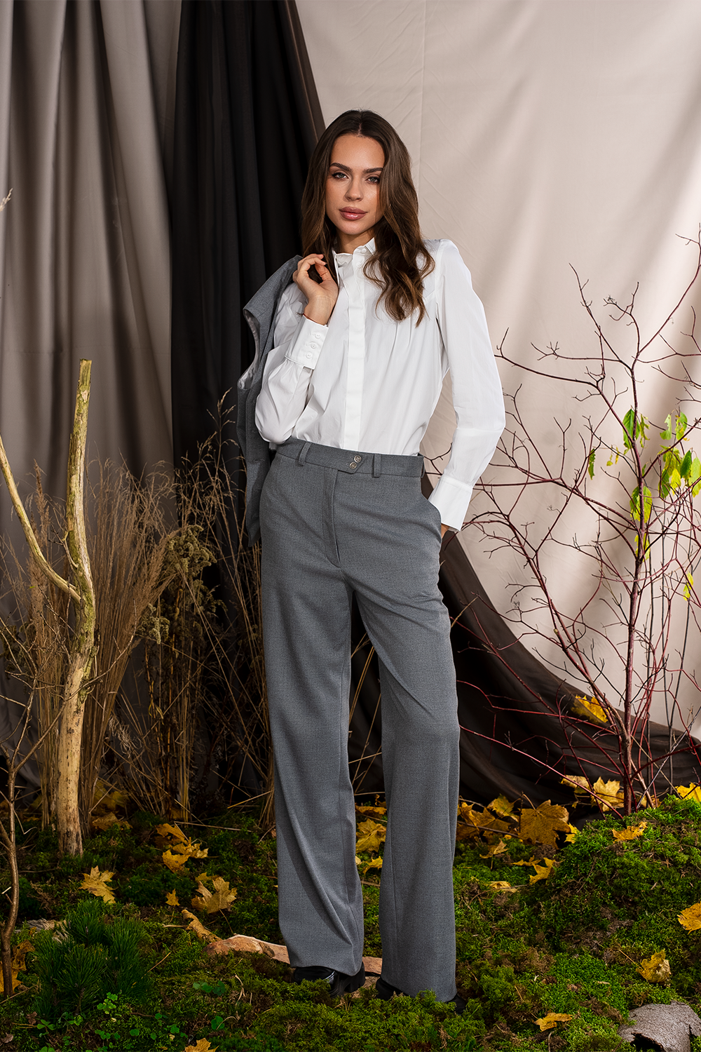 “Sidabro šydas” kelnių grakštumas išreikštas tiesiu, klasikiniu siluetu ir aukštu liemeniu, kurį subtiliai įrėmina įliemenuojantys įsiuvai – lyg skulptorius, suteikiantis figūrai formą. Priekyje paslėptas užtrauktukas ir šoninės kišenės tarnauja funkcionalumui. Galimybė rinktis vilkėti su diržu ar be jo - skirti sau laisvę kaskart atrodyti kitaip.