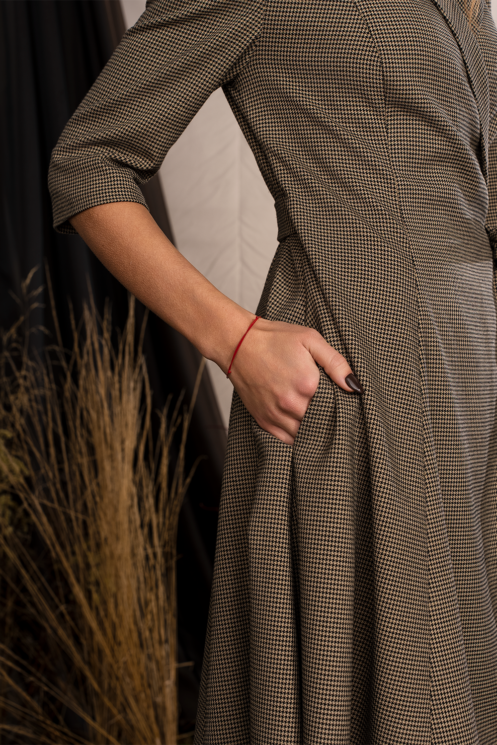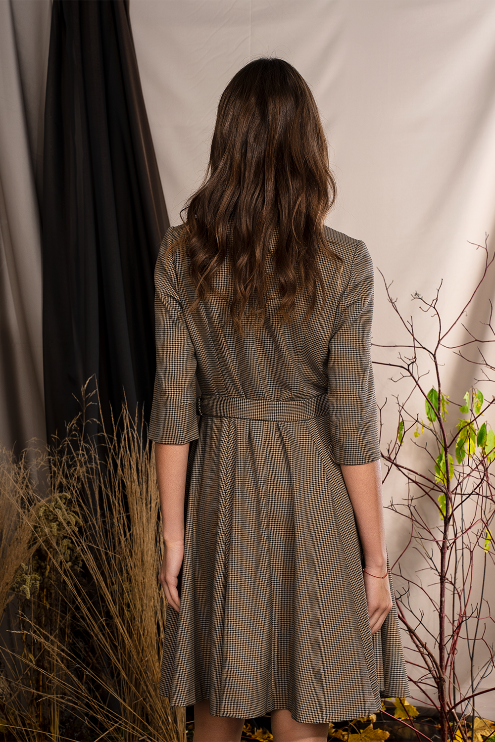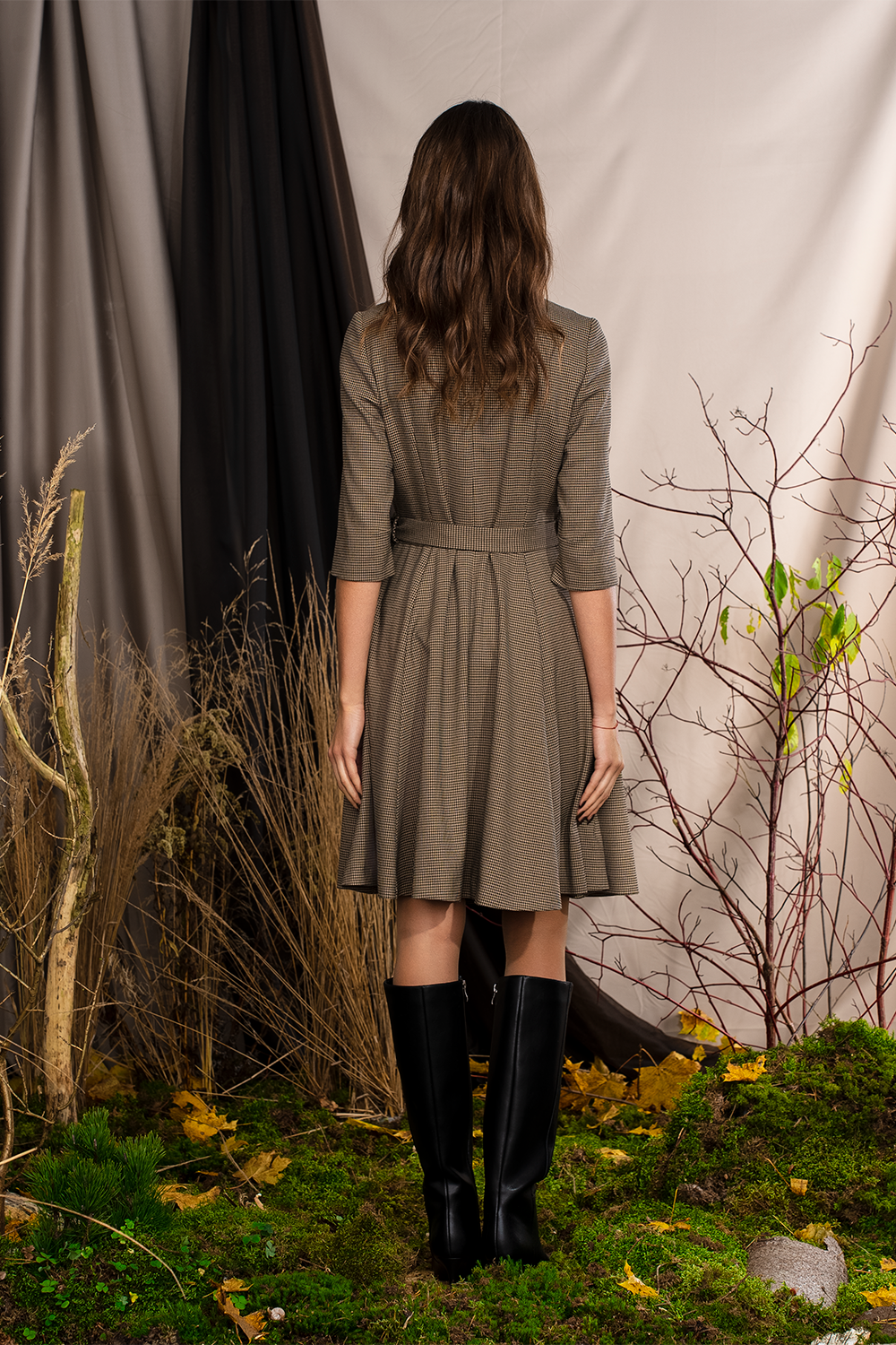 Ši suknelė - tai duoklė, kurią sukūriau nesenstančiai klasikai ir moters figūros grakštumui. Suknelės audinys pasakoja Jūsų elegancijos istoriją be žodžių - juodos ir rudos spalvų šokis primena rudeninio miško šešėlius ir židinio skleidžiamą šilumą. Ši suknelė dėl savo geros audinio sudėties tarnaus Jums ne vienerius metus.