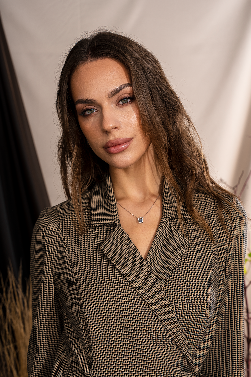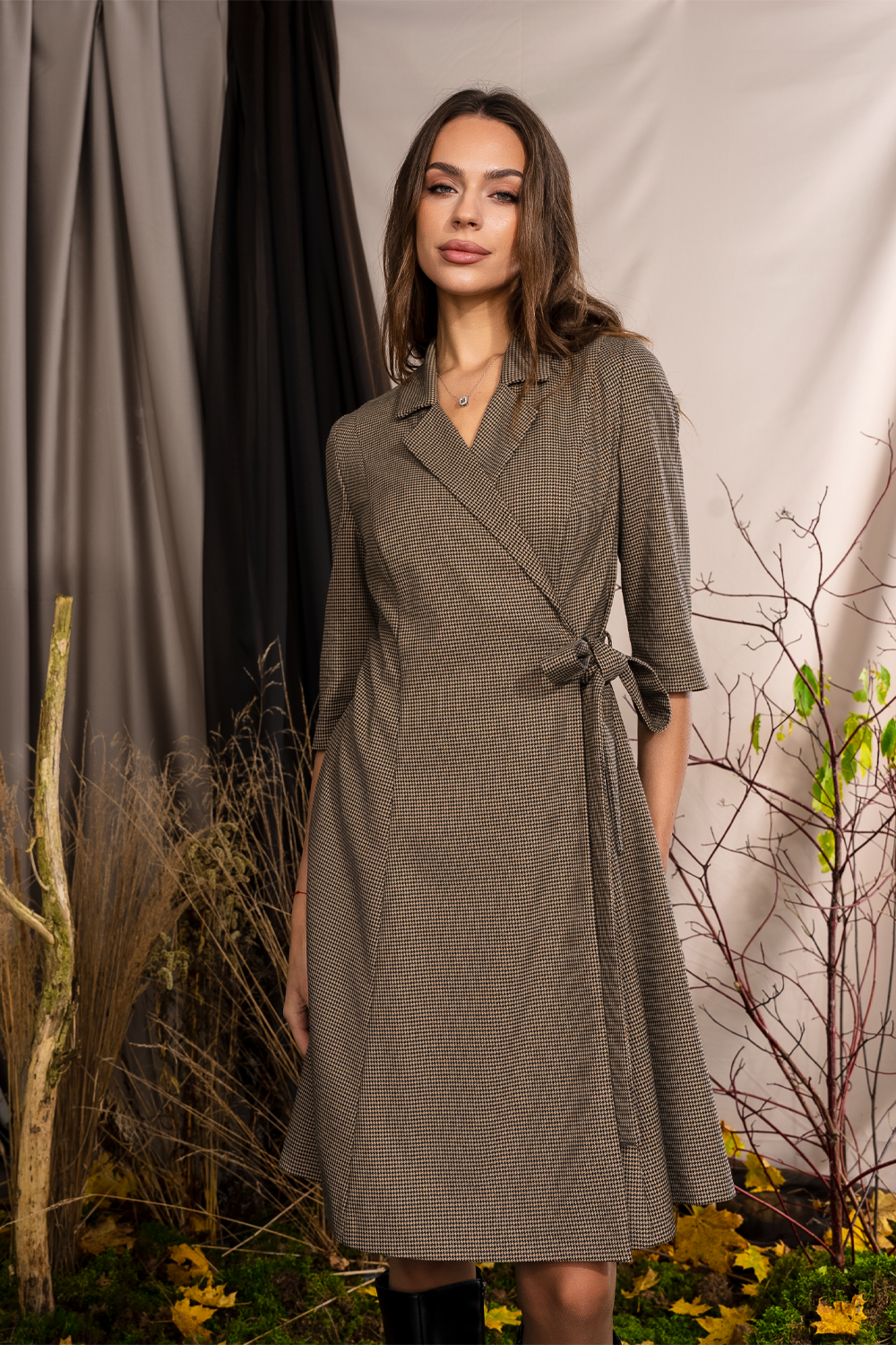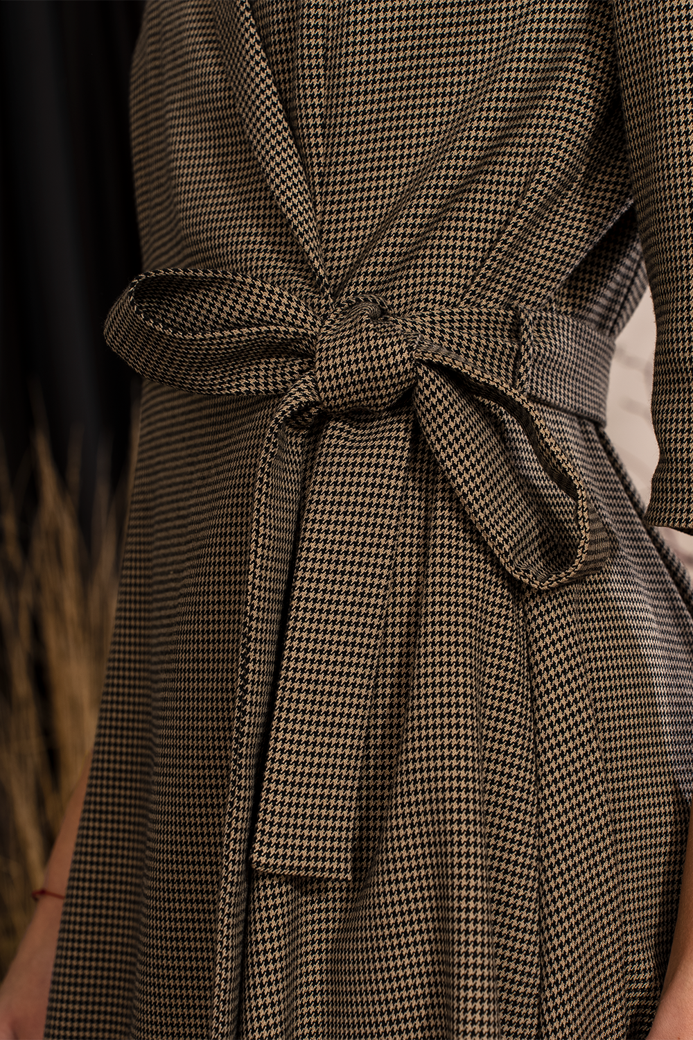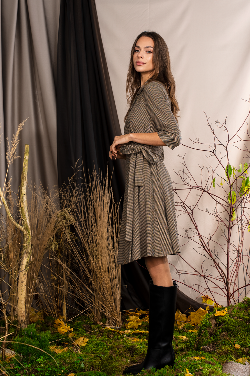 Ši suknelė - tai duoklė, kurią sukūriau nesenstančiai klasikai ir moters figūros grakštumui. Suknelės audinys pasakoja Jūsų elegancijos istoriją be žodžių - juodos ir rudos spalvų šokis primena rudeninio miško šešėlius ir židinio skleidžiamą šilumą. Ši suknelė dėl savo geros audinio sudėties tarnaus Jums ne vienerius metus.